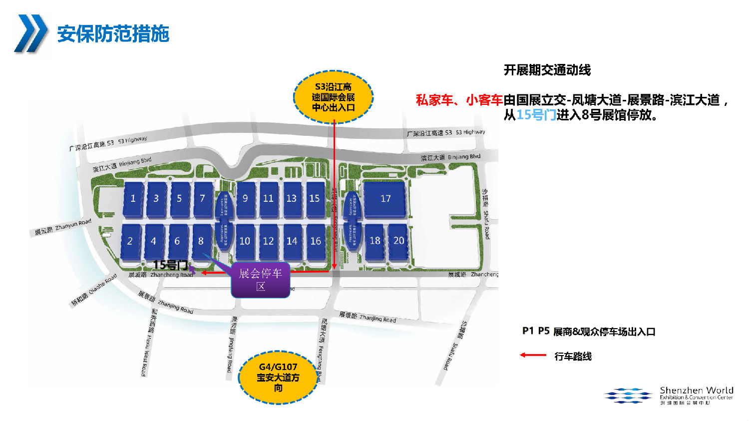 自驾车、私家车请导航至深圳国际会展中心南登录大厅,停车场入口指引