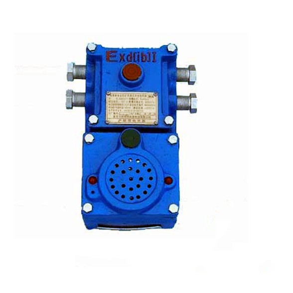 该产品集打点按钮、防爆灯、防爆电铃、三通接线盒为一体,隔爆接线腔内设打点按钮,并有三个出线口,取代了打点按钮和三通接线盒,用高亮发光二极管和矿用防潮扬声器取代了防爆灯和隔爆电铃。通过电源连线实现载波对讲通讯。