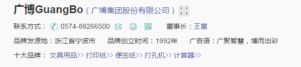广博集团股份有限公司创建于1992年,是一家集办公文具、印刷纸品、塑胶制品和进出口贸易等为一体的现代企业集团,拥有员工4000多名。拥有14家控股子公司,在洛杉矶、香港设立海外分公司,在国内拥有30多家营销分支机构,拥有浙江、江苏两大生产基地。